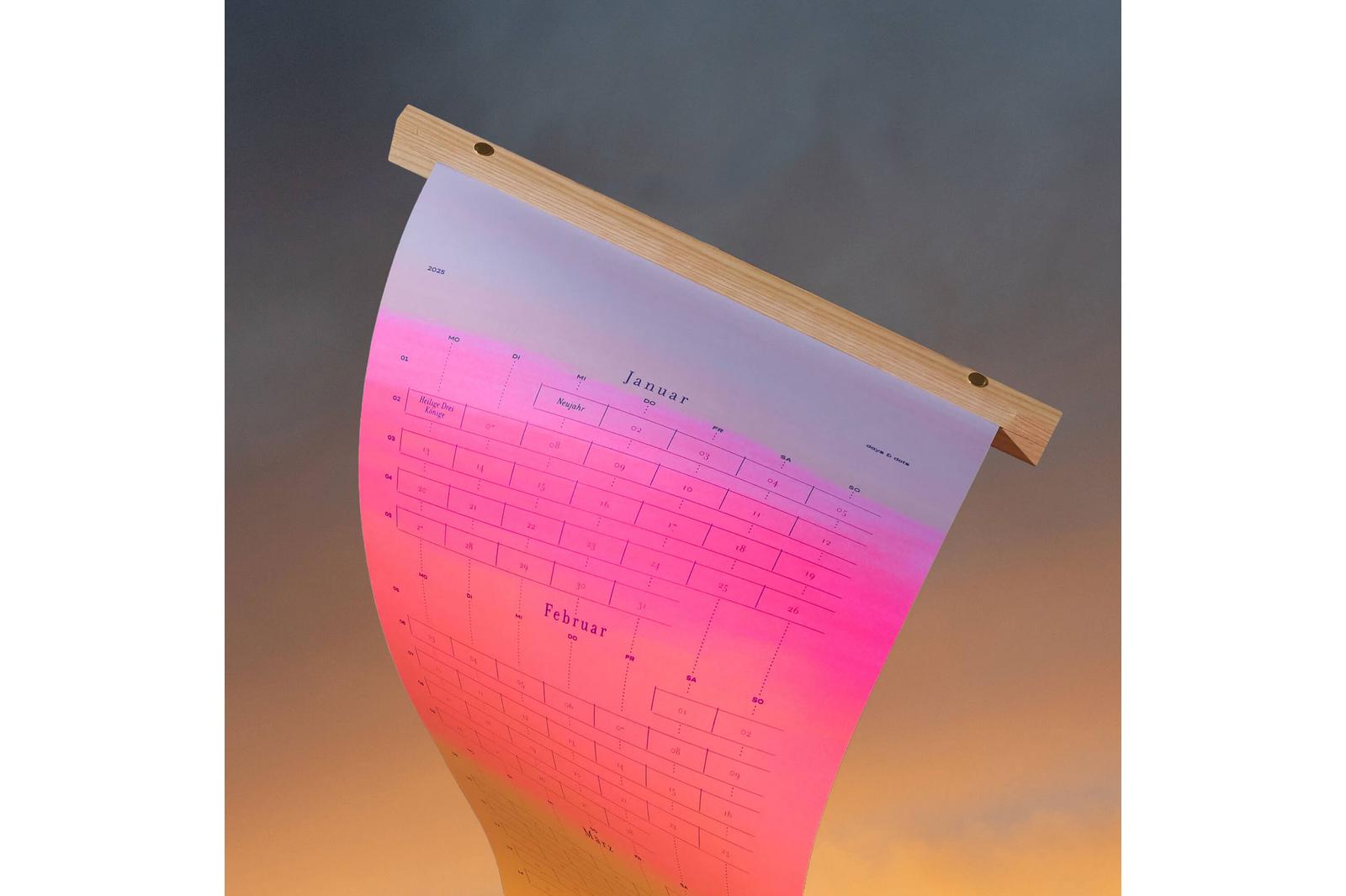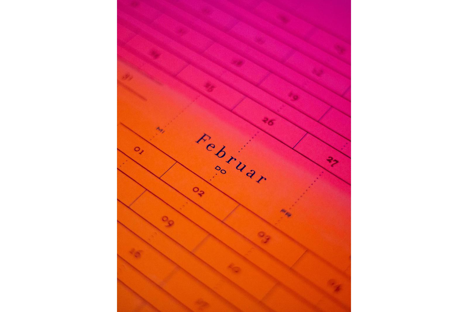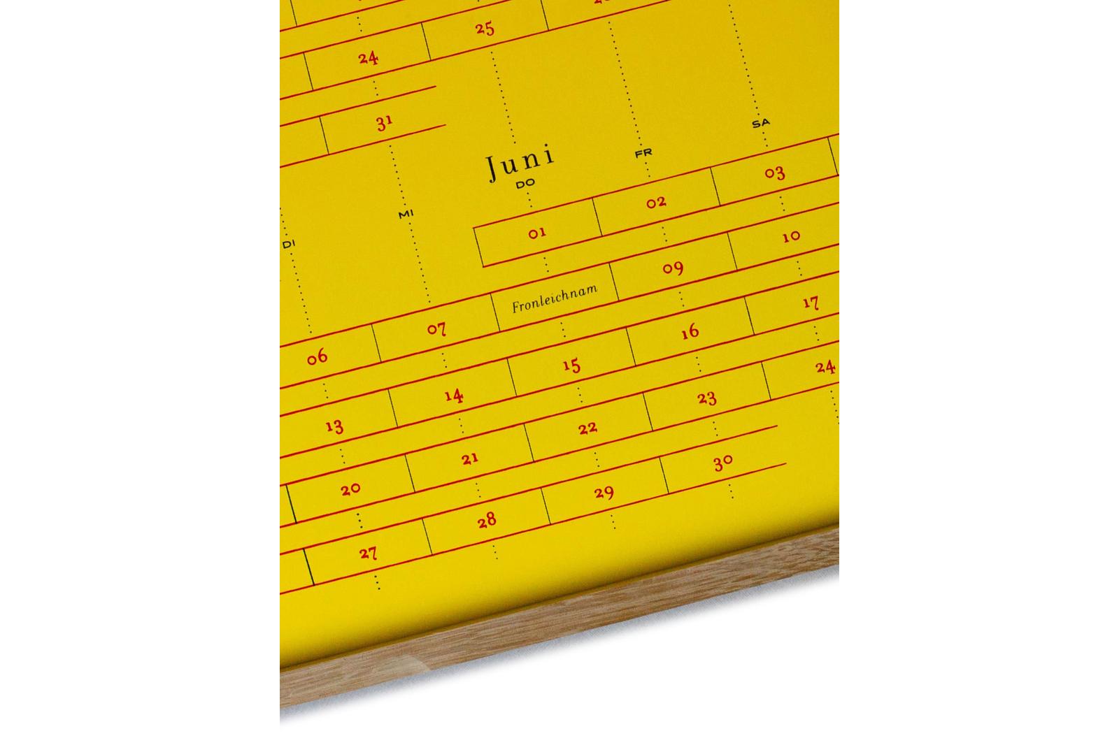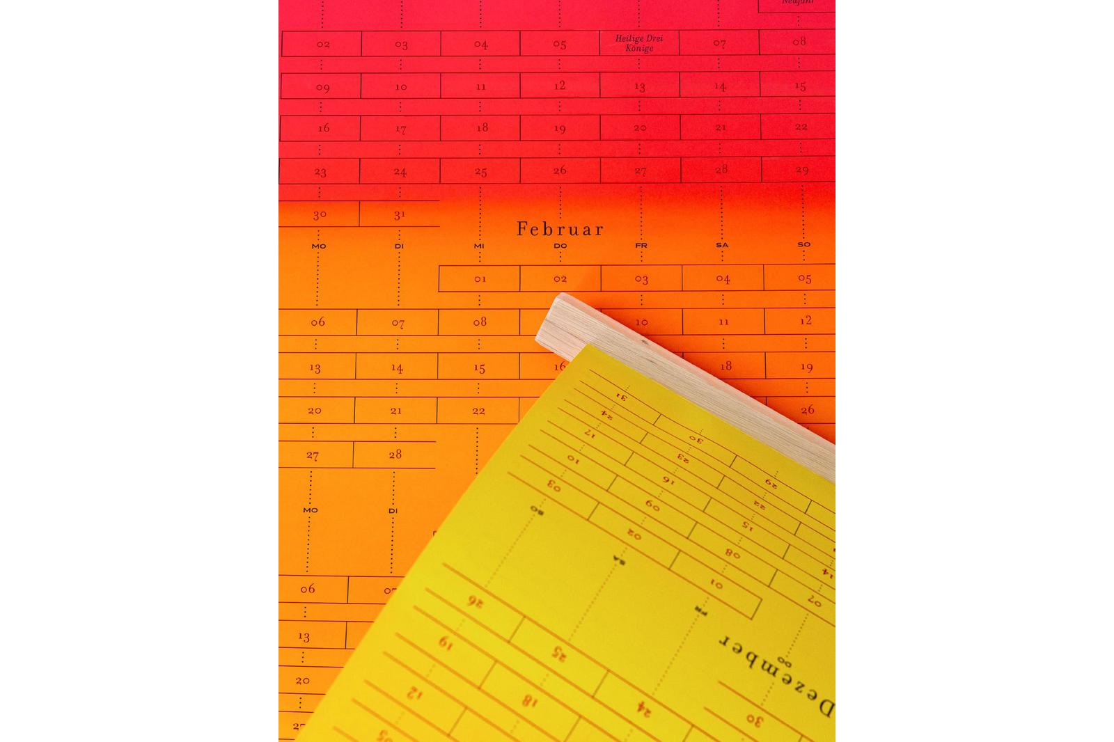 The double sided annual calendar by designer Johannes Nathow from Bielefeld in Germany is iris printed . Resulting in vivid colours, which make the stunning design and beautiful choice of typographie pop. January till June are printed on the front side, July till December on the flip side. The slim portrait format of this wallplaner makes it easy to find a good spot in any room.