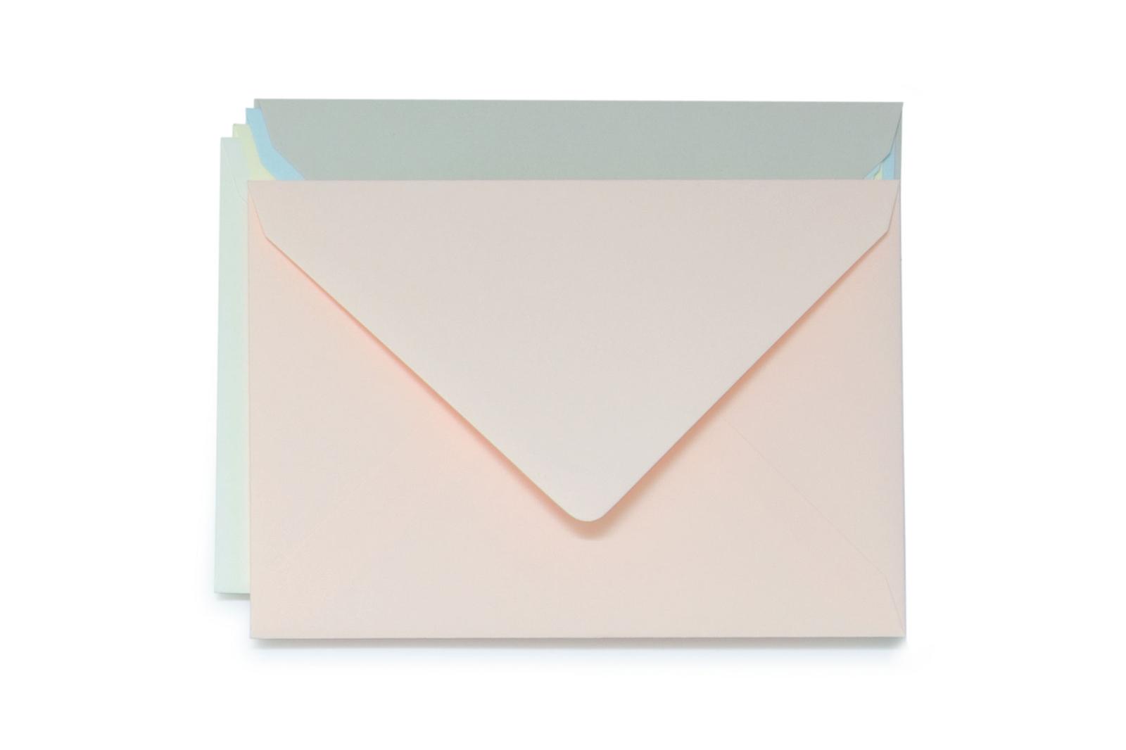 Die Kuverts sind ungefüttert und in fünf Farben verfügbar: weiß, gelblich weiß, hellgrau, hellblau, rosa.